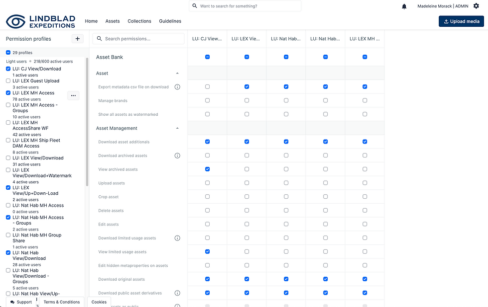 My governance strategy encompasses technical configuration, ensuring system security, and delivering tailored user experiences. I design and manage all role-based profiles and permissions, enforcing necessary security around Digital Rights Management (DRM). This also includes configuring tailored access views and custom download presets to streamline workflows for different internal and external user groups.